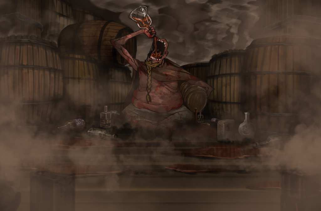 Drunkard has the appearance of a man with a long braided beard with a fat gut and scrawny arms. It is wearing a brown cloak and a pair of trousers, and is seen holding and drinking booze from different containers, also wrapping its left arm around a flowing keg.