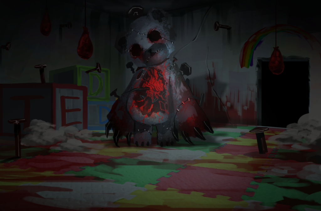 Hurting Teddy Bear is a large worn-out teddy bear, that has been impaled with nails. Its fur is faded and grey, and is coated with grime and bloodstains. The plush is missing its eyes, and its mouth has been sewn shut. Several other stitches can be seen all over the Abnormality's body. It has a round body, short legs, and big arms with sharp, black claws.