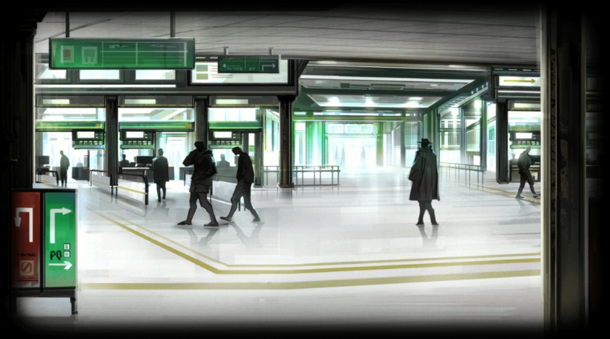 The interior of the border patrol checkpoint is almost completely stark white, with the corporation's signature green decorating the scant signage. The entrance fosters an incredibly oppressive atmosphere as languid-but-uncaring armed guards mercilessly bolster security.