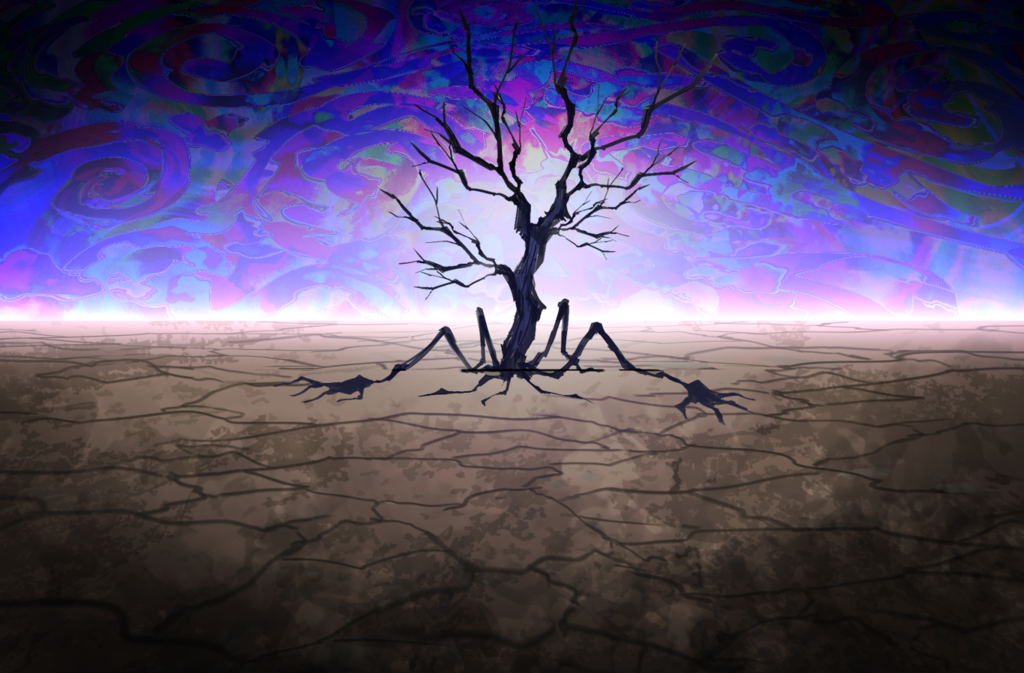 A resentful tree stands among a desolate plain.